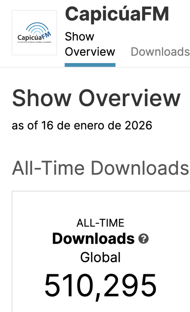 CapicúaFM publicó su primer episodio en junio del 2014 y alcanzó su primer aniversario palindrómico (11 años) en junio del 2025. Según Podtrac (uno de los dos sistemas de medición que utilizamos), superó las 510 295 reproducciones únicas a mediados del enero de 2026. Por supuesto, CapicúaFM tiene un RSS con su propia marca, lo cual aclaré en mi libro electrónico titulado Branded RSS Podcasting. Si quieres hablar de cualquier tema relacionado con las podifusiones, radio internética o la creación/alojamiento de sitios web, ponte en contacto conmigo aquí.