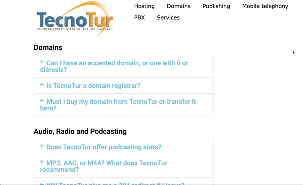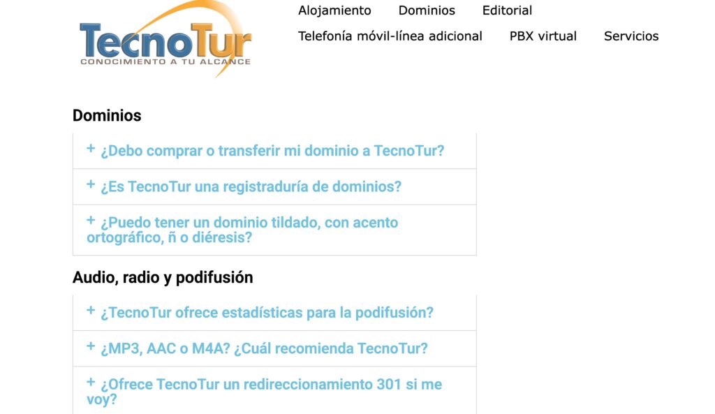 Arriba, una captura de pantalla parcial de la página de preguntas frecuentes del sitio web de TecnoTur.LLC en castellano. Inicialmente, todos los elementos están cerrados.