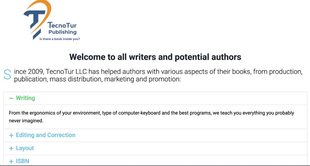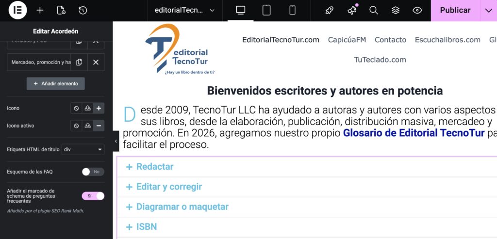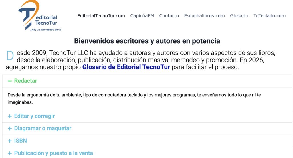Arriba, una captura de pantalla parcial de la página de inicio del sitio web TecnoTurPublishing.com en inglés. El primer elemento ya está abierto al acceder a la página y el cambio de color que elegí ya es visible.